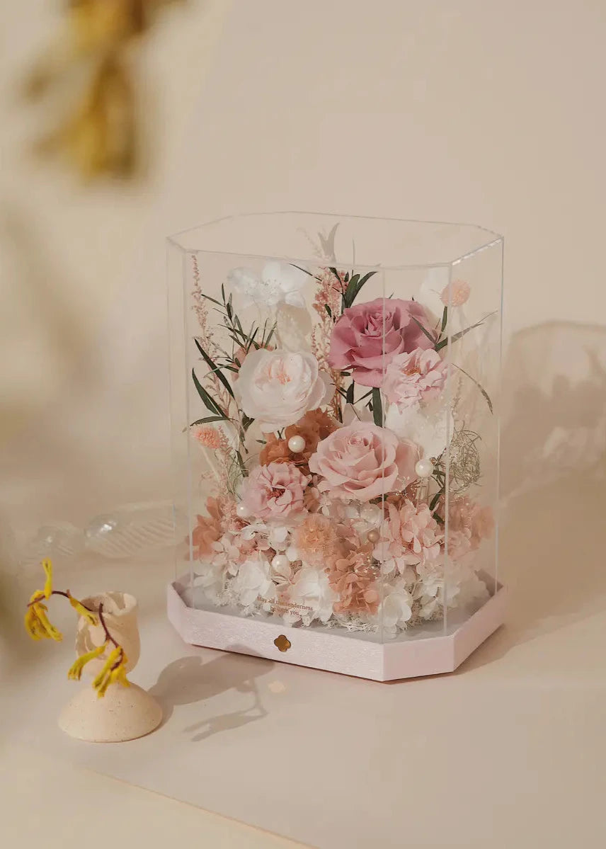 ALL preserved flower are handmade from 100% fresh flowers through complicated processes and it can be kept at least 3 years but avoid direct sunlight and keep it in a suitable environment.
